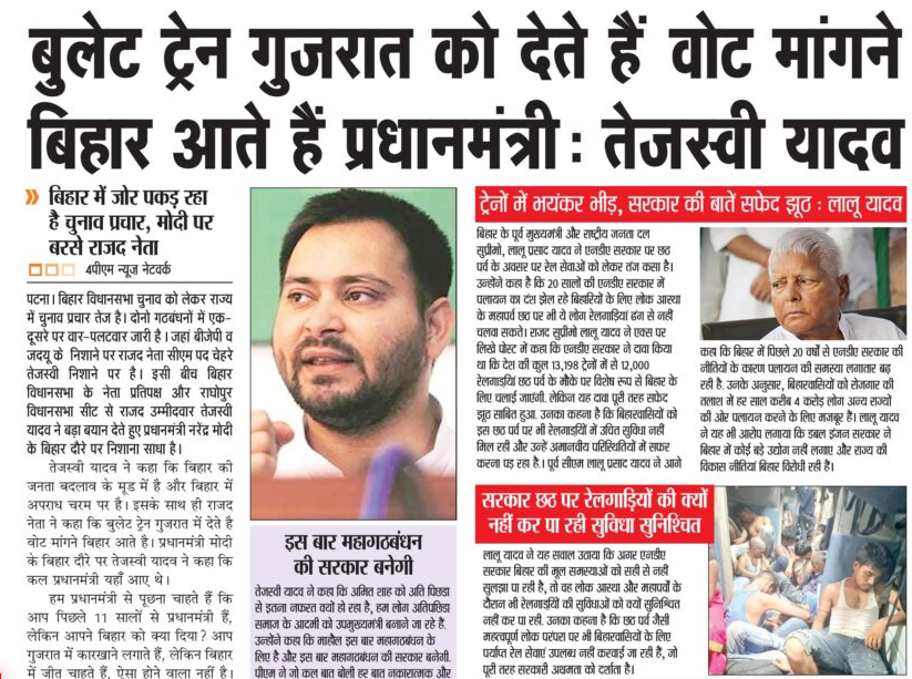 तेजस्वी यादव का पीएम मोदी पर निशाना: “गुजरात को बुलेट ट्रेन, बिहार को सिर्फ़ वोट मांगना”